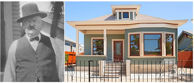 Vintage photograph of Peter Faust (left) in the early 1920s standing before his home at 2228 Imperial Avenue, San Diego, California. On the right is a photograph of the remodeled structure from about 2020.