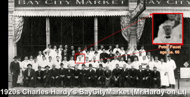 The staff of Charles S. Hardy’s Bay City Market. The gray haired gentleman indicated by the red box and in the blowup is very probably Peter Faust, chef clerk, Note that Mr. Faust has a pronounced tan line where his ubiquitous hat would have protected his head from the sun.