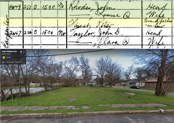 3512 Douglas Street, Dallas, Texas, the home in the 1930s and 40s of Katie Faust Thacker, Peter’s eldest child, who took him in a second time after earlier sharing her home when he returned to Dallas in 1928. Her husband Frank Thacker had died in 1927. The instructions regarding the location that appeared in the City Directory were “go around back, up the stairs.”A vacant lot is all that remains of 2649 Carpenter Avenue, Dallas, Texas the home of the John Rhodes family in 1940 that included Peter Faust (1862-1943).