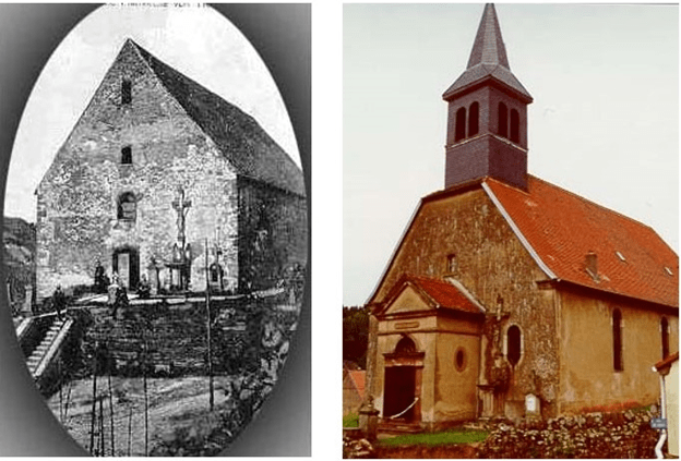 The parish church in Tieffenbach, Bas-Rhin, Alsace, France. On the left is a 19th century etching of the Église Saint-Barthélemy de Tieffenbach, (left) before the vestibule and bell tower were added. On the right a contemporary photograph of the church where Peter Faust probably took his first communion.