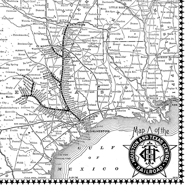 If he could have afforded a ticket, the teenager Pierre (or Peter) might have availed himself of a train ride on the Houston and Texas Central that already ran from Galveston to Sherman via Dallas before 1879. Fares in that day were limited by law in Texas to less than 3¢ per mile for first class and were as low as 2¢ per mile. However, even at the most uncomfortable “emigrant” class, the fare was over $8. This is equivalent to nearly $200 in today’s currency and was over a week’s wages for a common laborer. It is therefore doubtful that Peter rode the train, although the railway right of way may have provided a convenient and certain path from town to town as the map below illustrates.