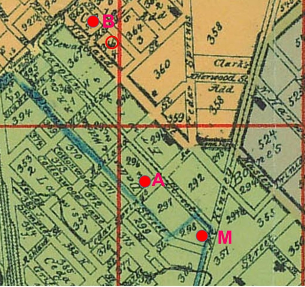 The Nachbarschaft [neighborhood] of Peter Faust and family 1885 to 1915. The red dot labeled A is the location of the first home of Peter Faust and Louise (507 Cedar); it was the birth place of Katie Faust Thacker and John P. Faust, the eldest children. The filled dot labeled B is the site of the home purchased later by the Faust family (523 N. Harwood St.) where Victor Babe and Jacob Faust (thee younger boys) were born. The open circle nearby is the estimated location of the home previously rented from Mr. Emgard after moving from Cedar St. The red dot labeled M marks the location of the Peter Faust Meat Market and later (after 1891) on McKinney at Caroline.