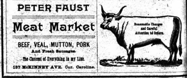 In the 1890s, the structures on McKinney Avenue were surveyed and appeared on the 1896 Sanborn Fire Insurance Map available from the Library of Congress. When Peter began work he worked for Hamm and Emgard, located on the “ne corner of McKinney and Caroline” according to the City Directory of 1888. On the map the Hamm and Emgard building is identified as a grocery (“GRO.”) at 143 McKinney Avenue. (Note that the number is in fact 143, despite the unusual handwritten typography.) Later, in 1891, Peter moved the business to the corner over Caroline to 137 McKinney (see Peter Faust Market advertisement from 1891-92 City Directory) that had bee,n a Hay and Feed store. At the time this part of Dallas was on the outskirts of town. Alamo and Caroline Streets were unpaved and McKinney Avenue had only recently paved with wooden blocks according, to the Sanborn maps.