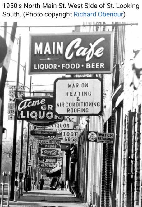 View of west side of North Main Street, Marion, Ohio looking southward. A stairwell just one door north of Acme Grill led to the efficiency apartments upstairs. You can barely make out a stone step at the bottom of the photo. The building called the Lust Block was built originally as the home of the J. F. Lust Candy company in 1894 (see next photo).[Image used by permission of Tom Photo]