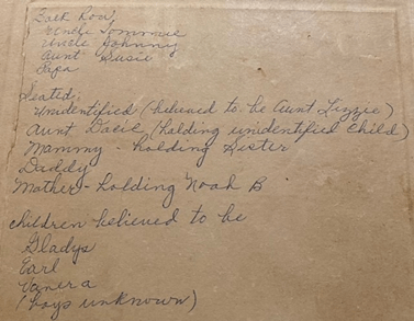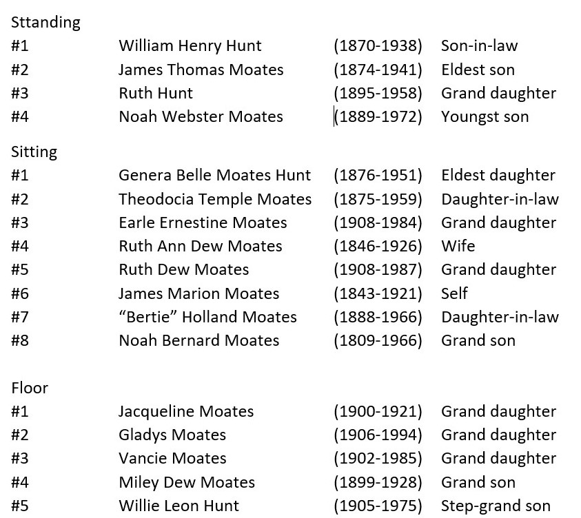 Thus, we have—with varying degrees of confidence—identified all of the individuals in this photograph. In summary they are [note an Errata in the following: Noah Bernard Moates was born 1909 not 1809]