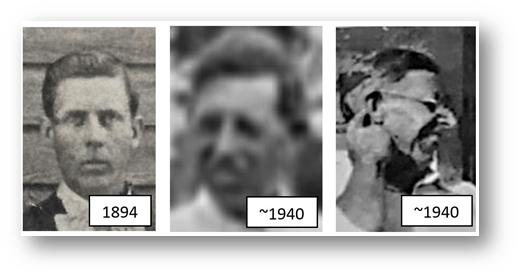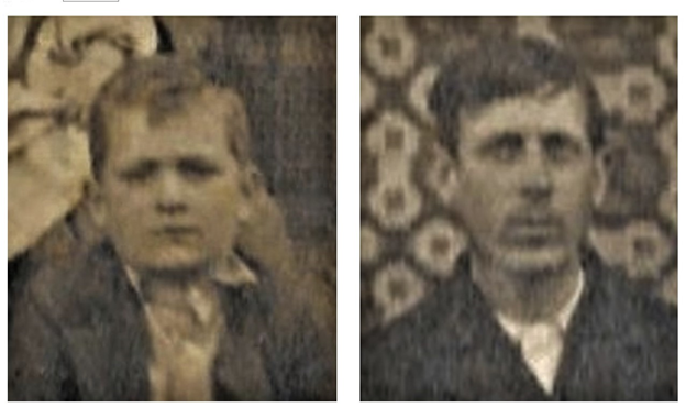 Willie Leon Hunt (Aug 1905-1975) age 5 yr 7 mo compared to Gentleman #1. Note the similarity in their faces: downward curving eye brows and similarly set eyes; thin-lipped, narrow mouth and protruding chin. The more rounded shape of the by may be attributed to his youth.