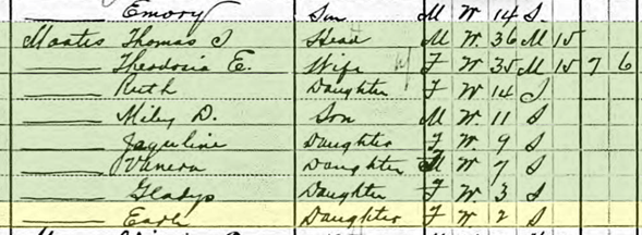 Let us now consider the remaining Moates children. In 1911 Tom and Docie had six children. Below is a reproduction of the 1910 U.S. Census where they are enumerated.