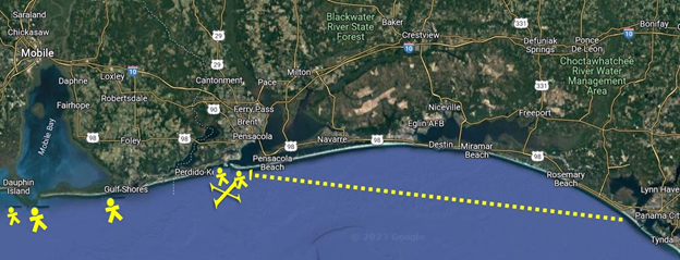 In the PLSS, key baselines were defined at various latitudes. In south Alabama the principal baseline aligns with the border with Florida. Thus, the southern edge of township 13N lies 78 (13×6) miles north of the Florida-Alabama line. Likewise, meridians running north–south were also defined, such as the one passing through St. Stephens, Alabama from which ranges were numbered east and west in six mile increments. Thus, range 20E lies 120 miles east of the St. Stephens meridian. Below is a map (courtesy of Wikipedia) of the lands subject to the PLSS.