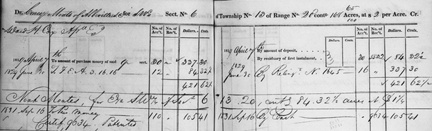 The page in original the land book for section 6 Township 13 [north] Range 20 [east] showing the transaction in which Noah Moates purchases the Eastern half of the Southwest quarter.