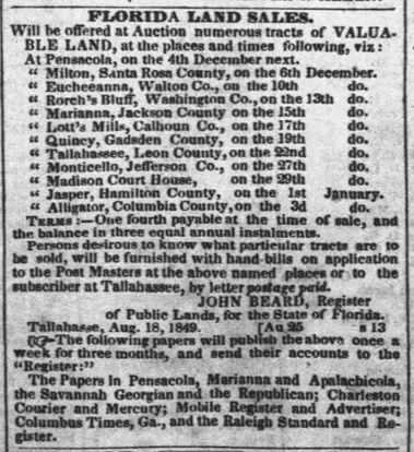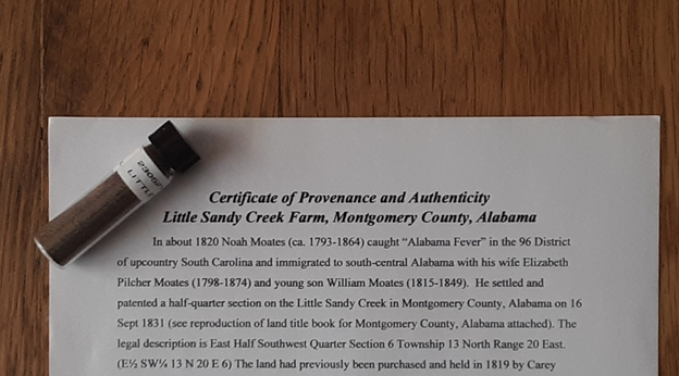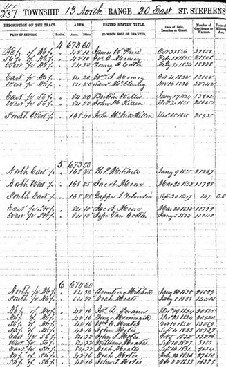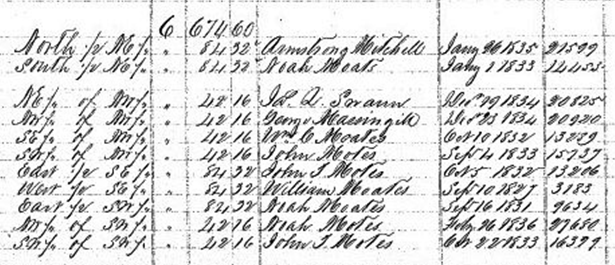 A close examination of the image reveals that in 1819, at the dawn of the statehood of Alabama one Carey Motes of Abbeville, South Carolina purchased the SW quarter of section 6 Township 13 [N] and Range 20 [E]. Subsequently, Noah Moates purchased the aliquot (a partial section) E½SW¼ of that quarter on 16 September 1831. The price was $1.25 per acre. Thus, he paid $105.40, a sizeable sum in 1831. The land was patented in 1838. A patent functioned as an official deed of ownership.