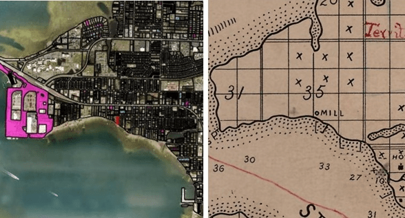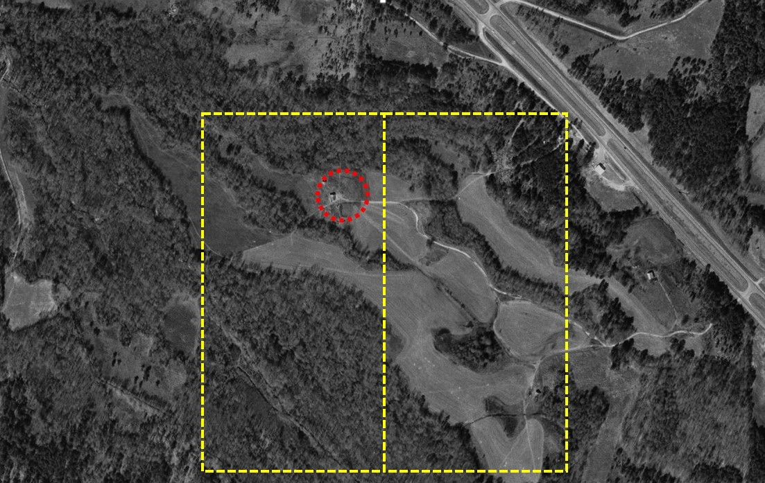 A 1971 topographic map with the property lines indicated. The map indicates roads and houses that correspond to those seen in the aerial photographs.Corresponding aerial photograph in which we can observe the collection of buildings, circled in red.
