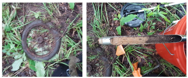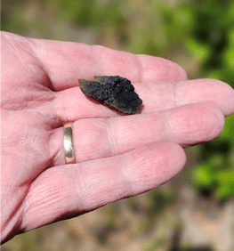A charred piece of wood found at the putative location of the original shared meeting house of the Orange Hill Methodist Church and the Union/Orange Hill (reconstituted) Baptist Church in the 1870s. Source: Sam Matteson 14 April 2024.