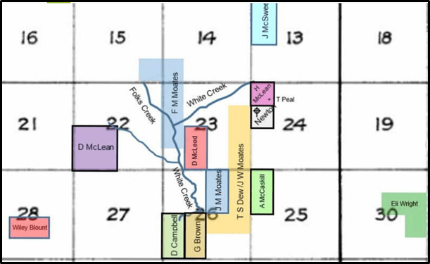 Section 23 and adjacent aliquots of land passed into the possession of several Moates Family members. In fact, family history recounts how the gentle rise in the landscape the buggy driver encountered as he approached the cemetery from the town center to the west was informally called “Moates’ Hill.” Below is a schematic of the property patents in the early post-war days.