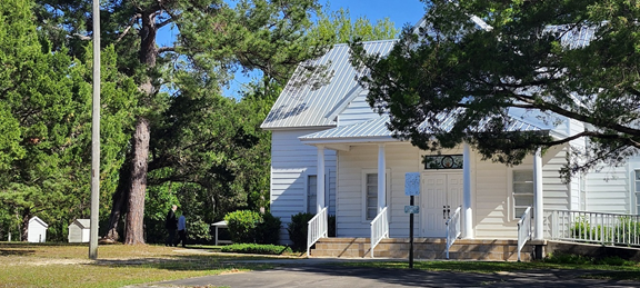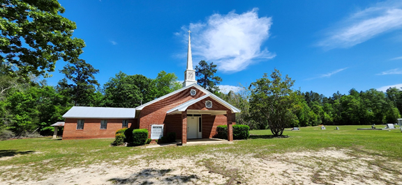 Church house built by Orange Hill Methodist Church on the site of the original log church shared with Union/ Orange Hill Baptist Church after the original structure burned. Note the substantial stone steps leading to the front door of the church house. Image Source: OHMC archives. United Methodist Church 1167 Sunday Road, Chipley, FL, 32428. The cemetery is visible to the right of the church house. (Photo taken by S. Matteson 14 April 2024)