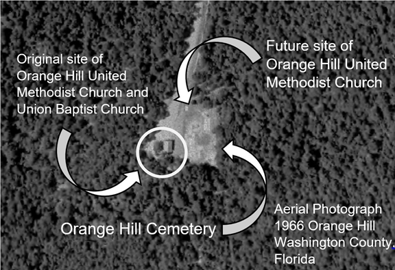 Both in the oral history of the Orange Hill Baptist Church documented by WPA historians in 1936 and in the church history of the Orange Hill United Methodist Church (OHUMC) we find that the first church house was a log structure located south of the Orange Hill Academy. The Academy was held in high esteem as the first Baptist-supported educational institution founded in Florida. The Baptist congregation met in the Academy building but later moved into the log structure shared by the two congregations, the Baptists and the Methodists—at least until it burned to the ground. Following the conflagration, the Baptists relocated farther south off the hill while the Methodists rebuilt the church on the same spot. The reconstructed (Methodist) church house is shown in the photo. (The photo was obtained from the archives of OHUMC.) Ultimately, the Methodist congregation built a modern church house on the site of the defunct Academy. (See photo.)