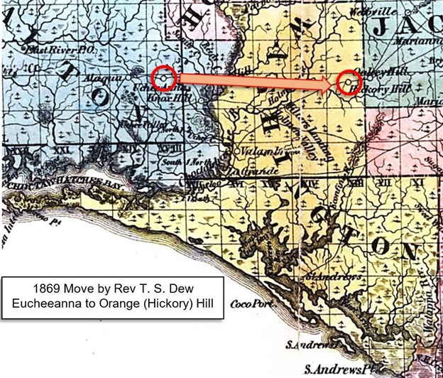In 1869—not long after his beloved wife of over 30 years, Elizabeth Atkinson Dew had died—Rev. Thomas Spenser Dew left his farm and ministry in Eucheeanna in Walton County, Florida that was situated across the road from the Euchee Valley Presbyterian Church to move to the community of Orange Hill, Washington County, formerly known as “Hickory Hill.”