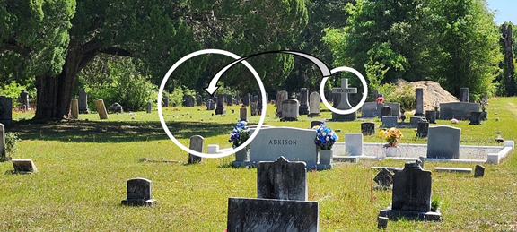 The location of the grave of Mary Ann Dew Sowell (left circle and arrow) relative to Irvine Family cross-shaped memorial (smaller circle on right). The image is looking eastward from the vantage point of the entrance of the service road into Euchee Valley Cemetery.