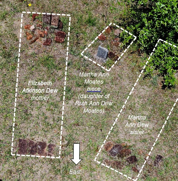 An examination of the layout of the plots adjacent to Mary’s resting place suggests the potential identity of the interred. Immediately to the north of Mary’s grave is an unidentified grave marked with nineteenth century era fired bricks. I suspect that this is the grave of Elizabeth Atkinson Dew, Mary’s mother. This idea is very plausible and persuasive. The next plot contains the unidentified grave of a child, marked with both similar bricks and a small granite, lichen-covered standing slab. I believe this is the final resting place of little Martha Ann Moates, the daughter of James and Ruth Ann Moates, who died on 24 March 1870 according to a family Bible entry. At about the same time (before Dec 1869) her Aunt Martha Ann Dew (and her namesake) disappeared from the public records, presumably dying before 1870. In the photograph below we see an overhead view of the three graves.
