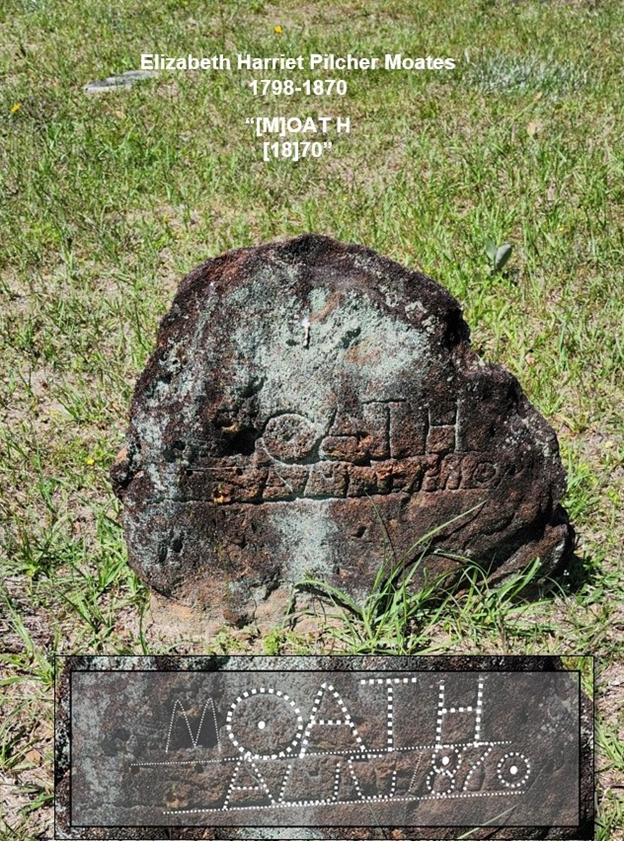 I had come to Walton County in hope of finding the graves of the patriarchs Noah and Elizabeth Harriet Pilcher Moates on the family farm a mile down the road. I found no evidence of a family graveyard on the White Creek Farm. I was pleased later to find the potential graves of their family as I have described. Then observing the graves that surrounded those that we have encountered above, I chanced upon two red sandstone markers. One was completely degrade but the one on the left (facing eastward) bore a partial inscription that froze me in mid-step. The sun was at just the right elevation to cause the surviving engraving to stand out in high contrast. I discerned the letters [ ] OAT H. Could this be the tombstone of Elizabeth Harriet Moat/Moates? I am persuaded that, indeed, this is the case. In the photograph I have superimposed my probably reconstruction of the inscription on the image of the stone. The “O” with its idiosyncratic central dot is unmistakable. The date of death appears to be Aug 1870 (a date unquestionably ending in zero). This correlates well with Dame Moates appearance (as “Elizabeth Wilhout age 73” as we explored in an earlier blog) in the 1870 census taken the 25th Day of August that year. On her right—the traditional position of the male spouse—is a much degraded sandstone monument that I infer marks the grave of Noah Moates, my 3x great grandfather, who perished on 2 Feb 1864 according to unconfirmed genealogical information that I found on ancestry.com.