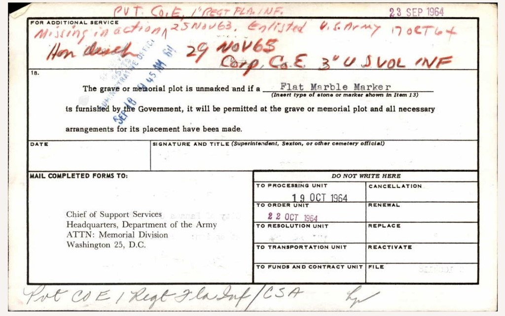 Verso (back side) of headstone application that mentions the union service of Corporal Francis M. Moates in 1864.