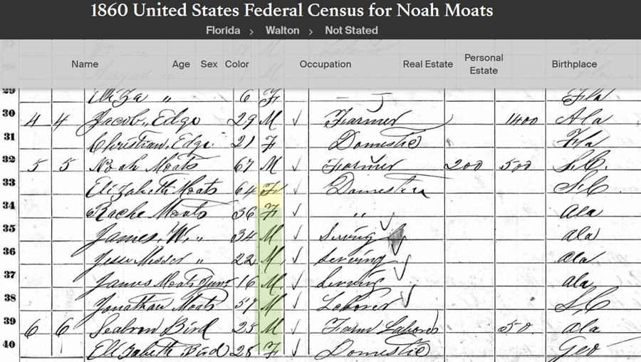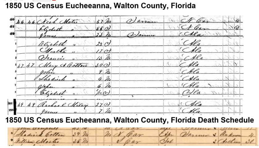 In 1850 Noah and his family appear in the US Census for Eucheeanna, Walton County, Florida. The family occupies three separate structures, namely #46, #47, and #49, their names appearing along with those of two deceased family members (son-in-law Shadrach Thad Cotton Æ 39 and son William Moates Æ 35) [note: Æ denotes “at the age of”] who perished in the previous year, respectively in April and February 1850, according to the census “Death Schedule.” The Euchee Valley entourage included Noah (Æ 57) and Elizabeth (Æ 55), two surviving sons (James Æ 23 and Francis Æ 13), four daughters (two unmarried: Elizabeth Æ 22, Martha Æ 17, and two other married daughters who were widowed or abandoned, namely: Mary A Moates Cotton (Æ 30), and Rachel Moates “Miley” (Æ 27) and five grandchildren (comprising the four Cotton children and my great grandfather James Marion “Miley” Moates (Æ 7). This is a total of thirteen (13) living individuals who resided in proximity on the family estate. Below is a composite of the enumeration of the 1850 Census where these Moates folk appear. This large contingent required a substantial farm for support.