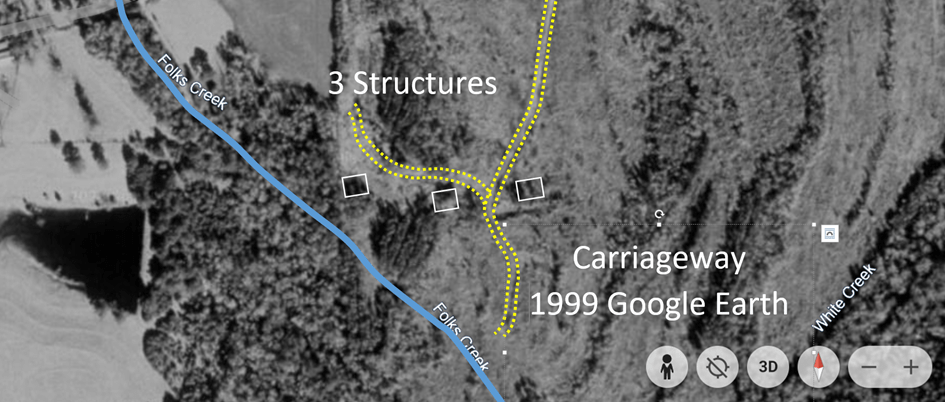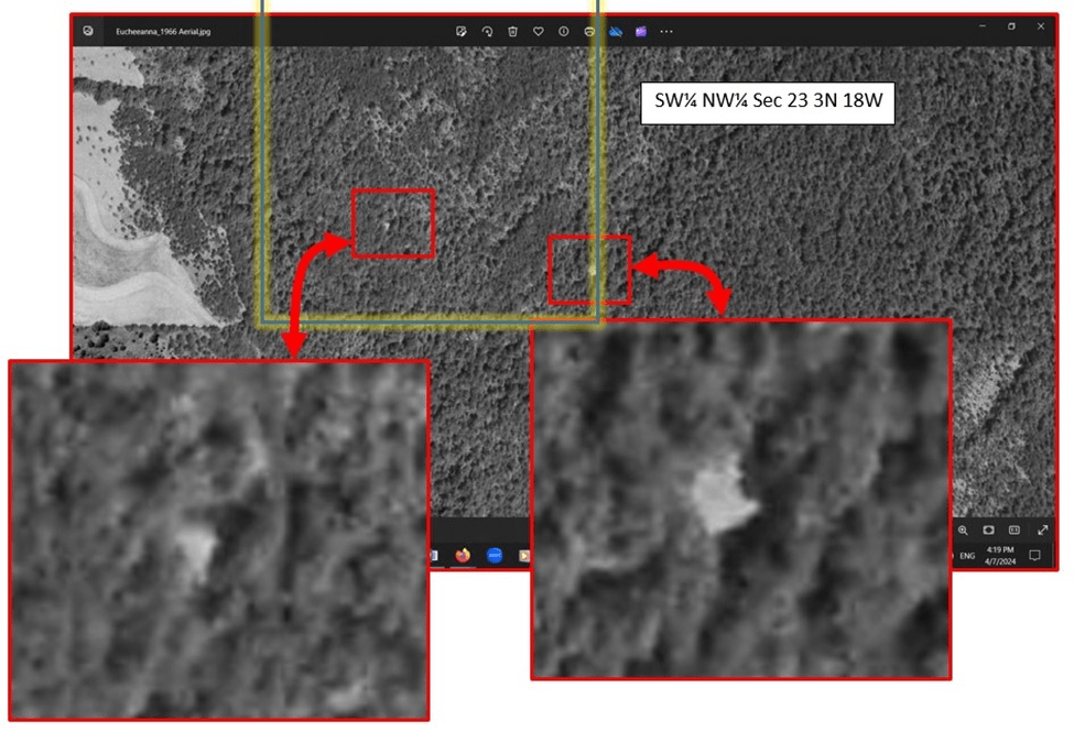 But is there any evidence of such structures on the land? A tantalizing aerial photograph from the mid-twentieth century below shows timber land had been harvested by clear cutting. It appears that there are four (or five) structures or their ruins on the acreage.