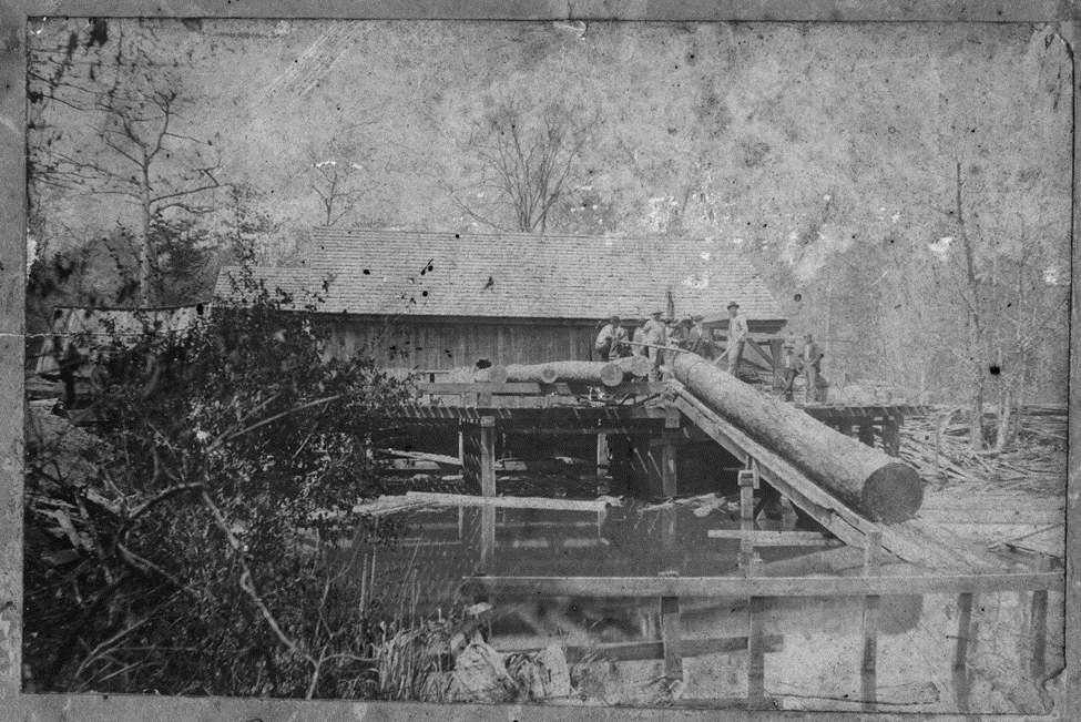 By 1890, the hypothetical Moates Brothers Mill must have ceased operation. We can confidently assert this as fact since the property was in the possession of a neighbor by then; it was sold to Mr. and Mrs. Lowe, who later sold it to William Crawford in 1885. Most real estate documents from before 1885 were lost in a courthouse fire that year. We can imagine what the mill might have looked like from a photo of a mill on Wrights Creek near Caryville, Washington County that is associated with Seymore B. Sikes the two-year-old child of the millwright neighbor of Francis Moates. (See Photo)