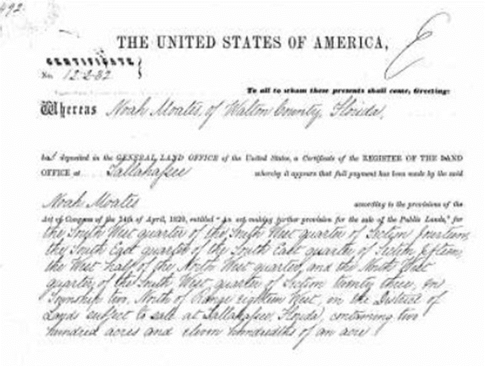 Thus, we can confirm that Township 2 North Range 18 West, Section 23, Walton County, Florida was the nexus of our Moates-Dew family’s activities from about 1850 to 1885. Although in later years, they relocated to southeastern Alabama and other counties in Florida, here the Euchee Valley cradled my great grandparents’ development that shaped us in the centuries to come. And in each generation afterward we inherited—knowingly or unknowingly—a legacy of sandy soil between our toes washed clean in the clear spring-fed creek water of our patrimony.