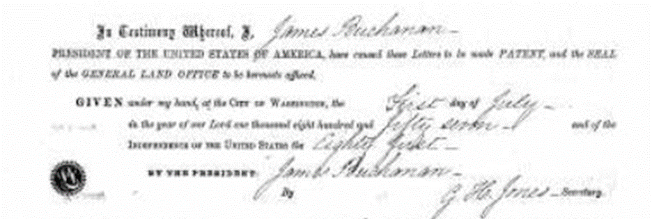 Thus, in 1850 they probably squatted on land that Noah later purchased. In 1853 Noah Moates filed for and was granted in 1857 a patent for an estate of about 200 acres in Township 2 North Range 18 West with aliquots in Sections 14, 15, but principally in 23. Below is a reproduction of part of the patent.