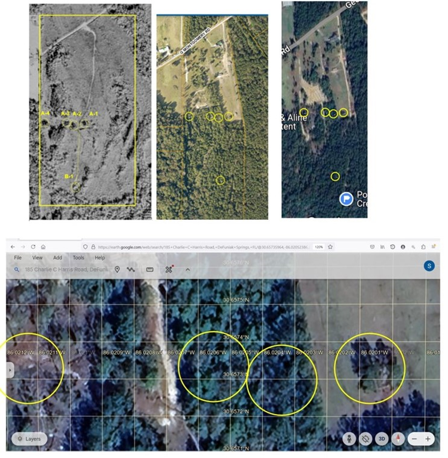 This property is located in present-day Walton County, near DeFuniak Springs. Florida. The bulk of the land is situated between George Montgomery Road and County Highway 280 E, on the north and south respectively. Two creeks (Folkes Creek and White Creek) transect the wooded property. The earliest topographic maps of the area date to the 1930s. (See figure.) We can discern a now-abandoned public (dirt) road that ran across the property (beginning near 8823 County Highway 280 E and crossing the property at 1385 George Montgomery Road) of my informants James A******* (Æ 85) and that of the current custodians George and Linda S***** [names redacted to preserve their privacy], respectively. The George Montgomery Rd property was owned from about 2000 to 2019 by Mr. and Mrs. B**** who had purchased it from the land agents Gillman, Fox and Grant. Mrs. B reports that they have no recollection of any structures extant on the property. On the other hand, Mr. A informs me that his father, Lorendel A (1911-1986) indicated the carriageway survived from “horse and buggy days.” He recounted how that the women would bring their wash down to the creek crossing to clean their clothes in the clear creek water of Folkes (or Folks) Creek. The carriageway crossed the creek at either a ford or a bridge that we estimate was located at approximately latitude and longitude (30.65491° N, -86.01999° W) and approximately 100 yards northwest (up Folkes Creek) from the confluence of Folkes and White Creek.